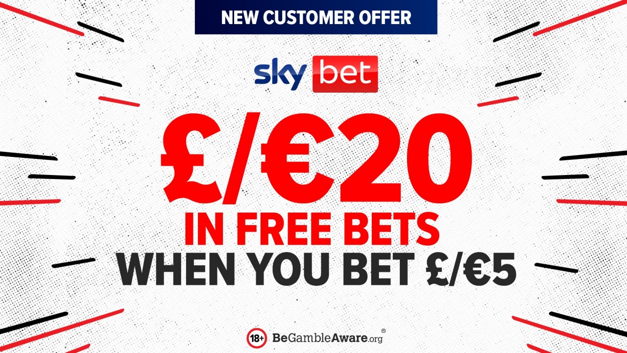 New Sky Bet customers can get £20 in free bets when they place a £5 bet. First single & EW bet only. Odds of 1-1 or greater. 2x £/10 bet tokens. Free bet stakes not included in returns. Free bets are non withdrawable. No free bet expiry. Eligibility restrictions. Full T&Cs here. 18+.