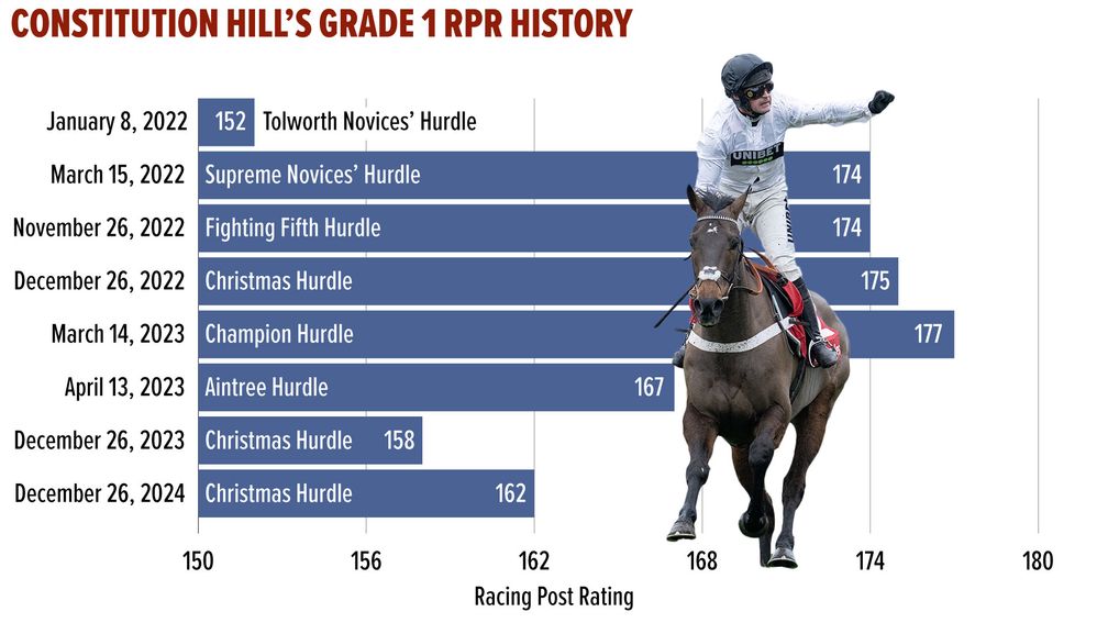 If someone tries to tell you 162 is all Constitution Hill is worth nowadays, they are either trolling you or they own State Man. Nico de Boinville reported that he felt his mount's fitness faltered approaching the last. That would be logical. Remember, there were only 37 days between his desperate gallop with Sir Gino at Newbury and the Christmas Hurdle.