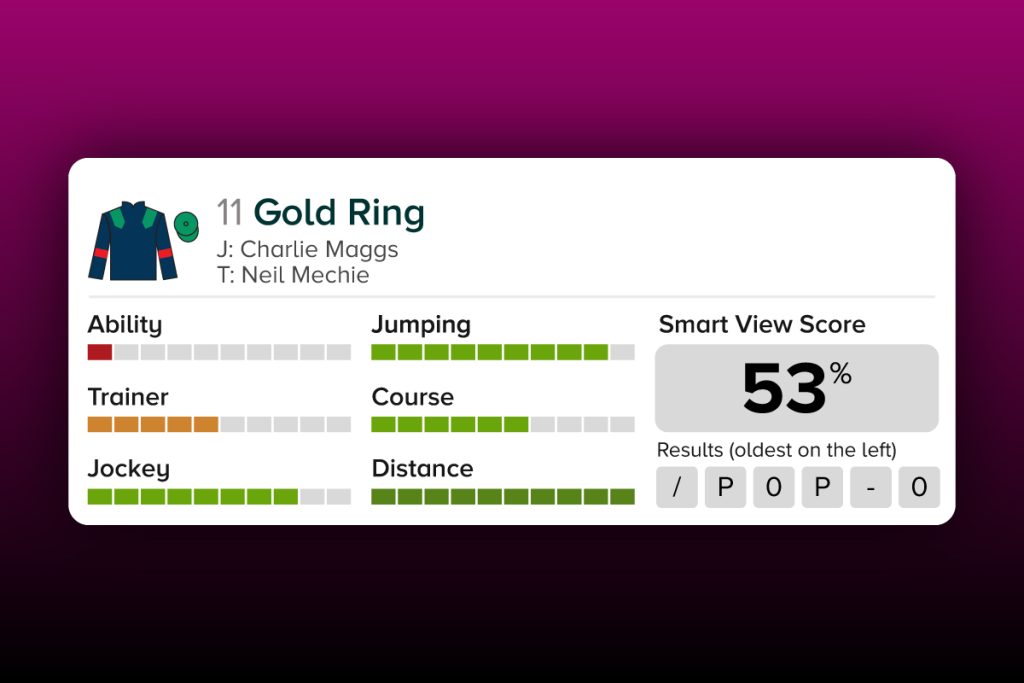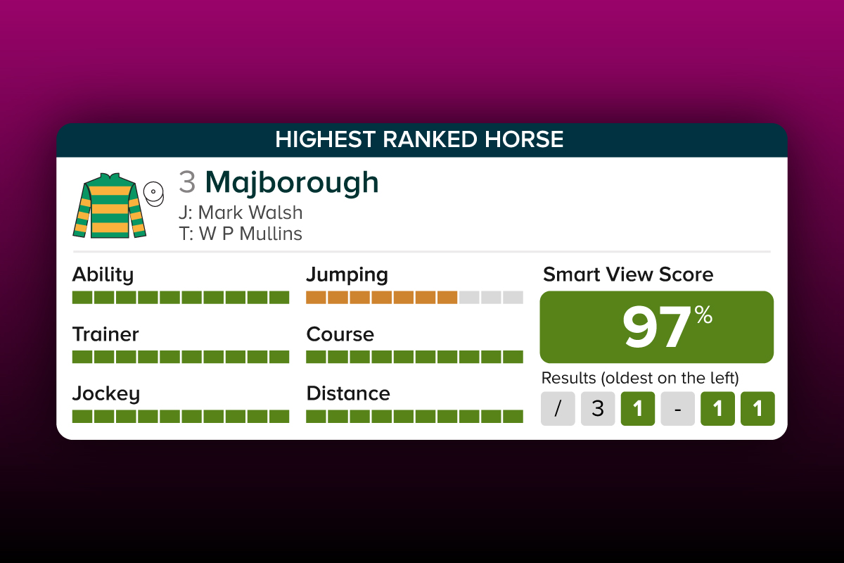 Smart View identifies six important attributes to help you find the winner of a race: ability, jumping, trainer, course, jockey and distance. Each of these attributes are scored individually, and then contribute to an overall Smart View Score.